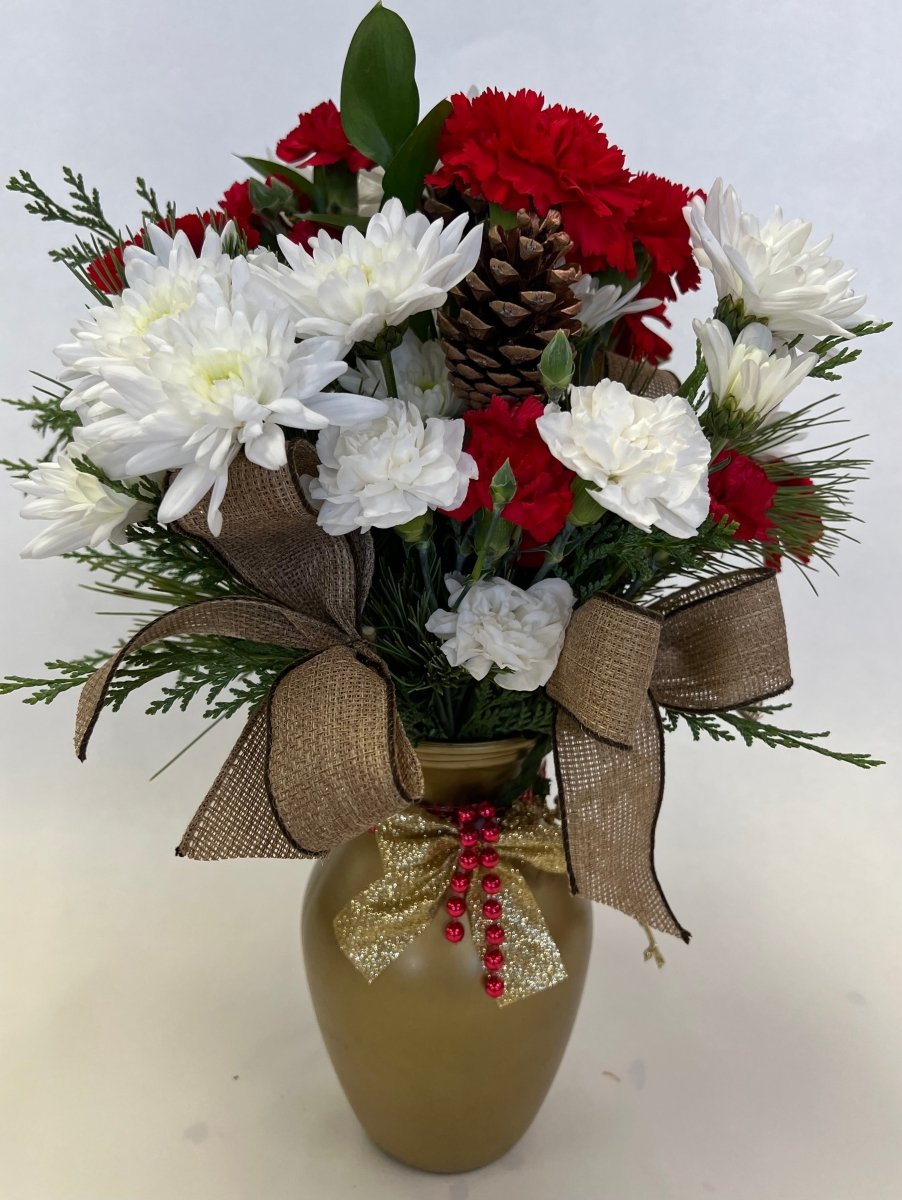 The Joyous Greetings Bouquet is an elegant collection of ivory, cream, red and green hues. Handcrafted with classic carnation, mum and assorted Christmas greens with pinecones and bow this bouquet brings the holiday cheer with each petal. This collection of flowers, set in a gold vase, instantly invites guests to share the joy and season’s greetings.