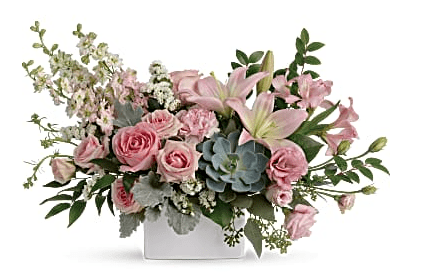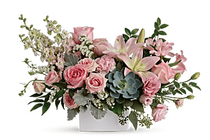 This feminine bouquet includes light pink spray roses, light pink asiatic lilies, pink alstroemeria, pink carnations, pink larkspur, white sinuata statice, dusty miller, israeli ruscus, huckleberry, seeded eucalyptus, lemon leaf, and a large green  echeveria succulent.Delivered in a white square vase