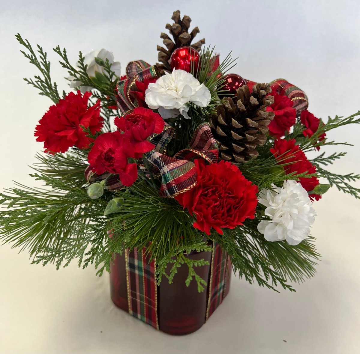 Red carnations and white miniature carnations are accented with tips of noble fir, pine, holly, and assorted greens. Delivered in bright red glass cube.